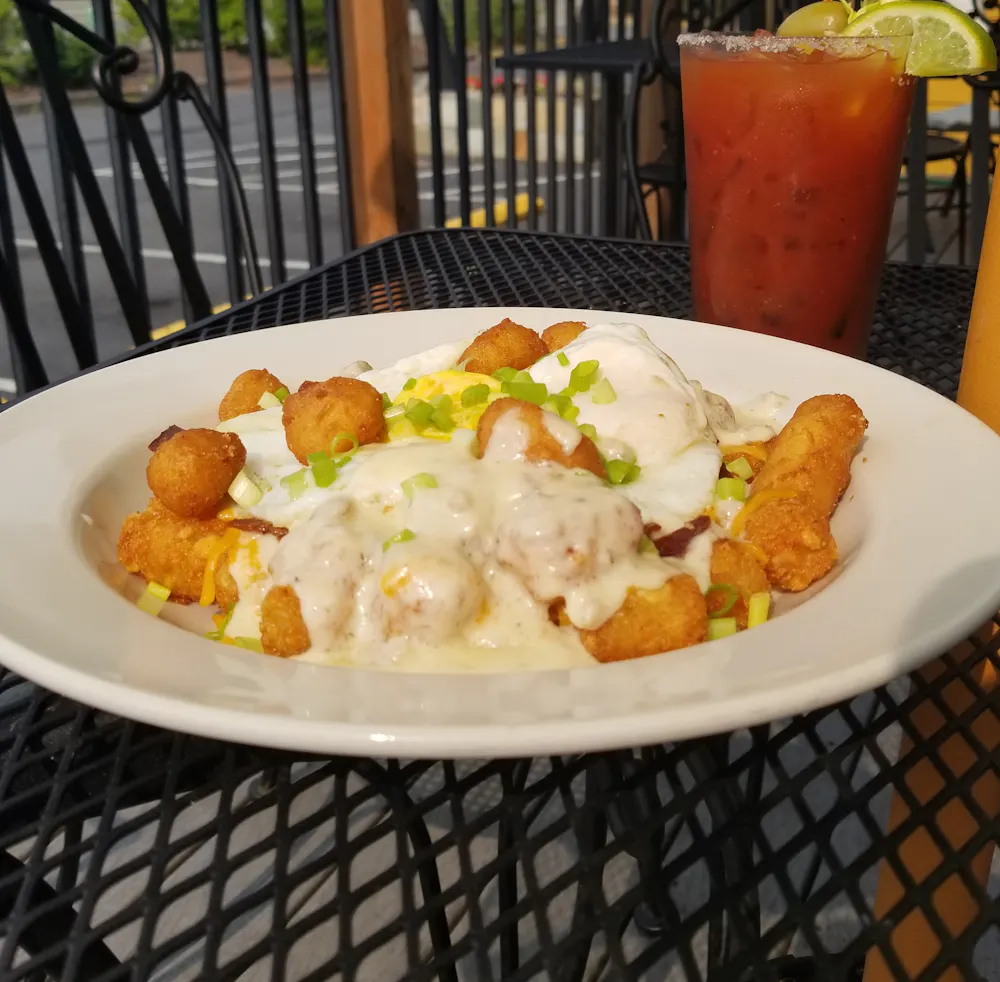 Biscuit topped with sausage patty, homemade sausage gravy, over easy eggs, and cheddar cheese.
